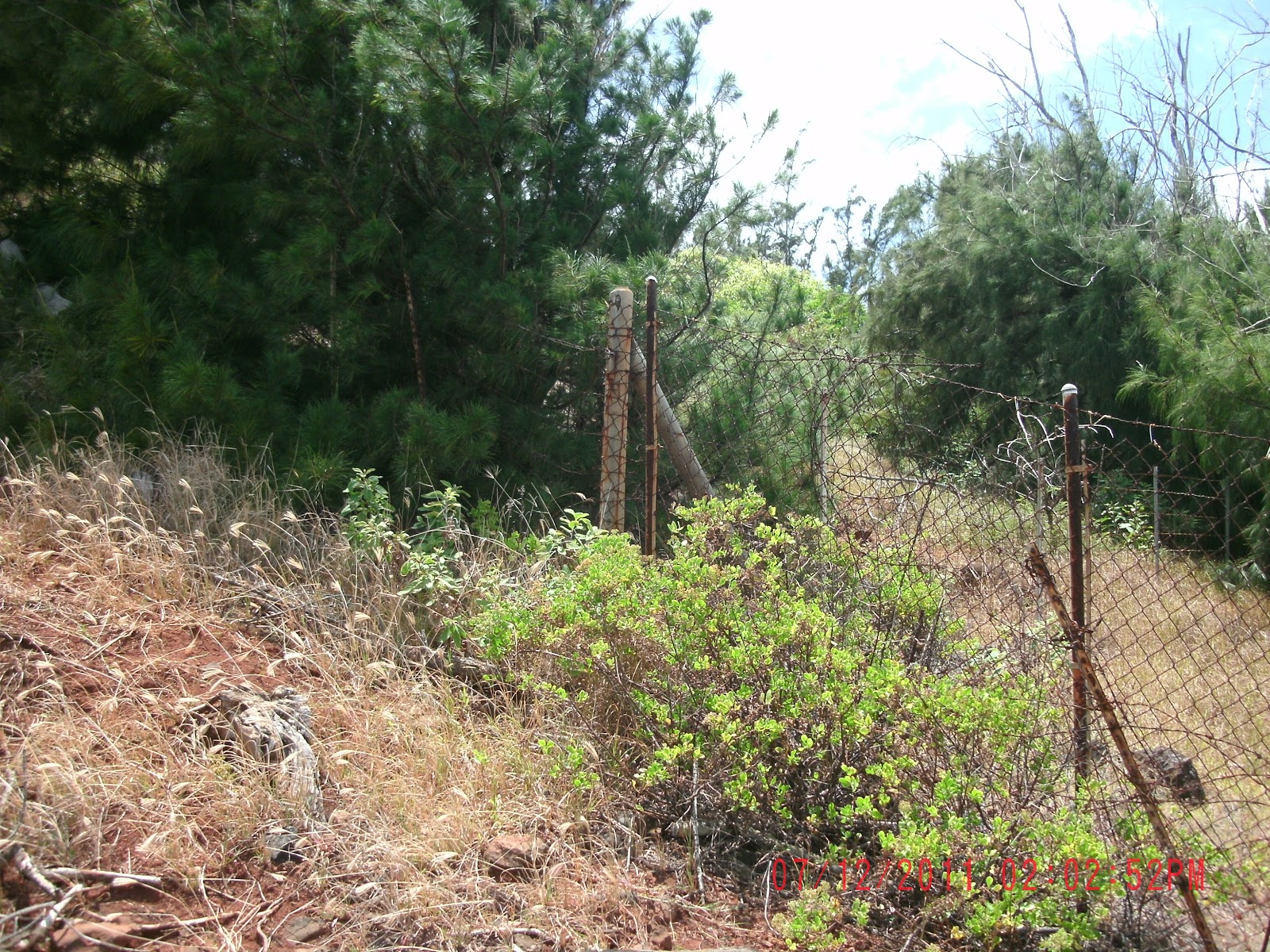 Patricia Hanwright has erected two visible sets of fencing in Kaakaaniu. One is depicted in the photos you have just seen at the Moloaa end of her property. The State of Hawaii Na Ala Hele program claims a trail right through that fencing as it feels that trail is part of an ancient ala loa trail. The second set of fencing done on Patricia Hanwright's property is visible from the Lepeuli public trail by looking southeast. These are the three images above. The bottom image (immediately above) is a close-up of the fencing.